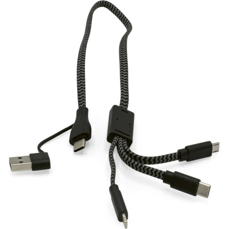 Versacord 5-in-1 cable tidy made from braided rPET. A sleek, portable pocket-sized powerhouse featuring the following connectors: two USB-C, one USB-A, one Micro USB, and one iOs-compatible cable, all neatly wrapped in a stylish tube made from recycled ABS. The Versacord keeps your connectors organized, protected from damage and always within reach. Individually packed in a kraft box.