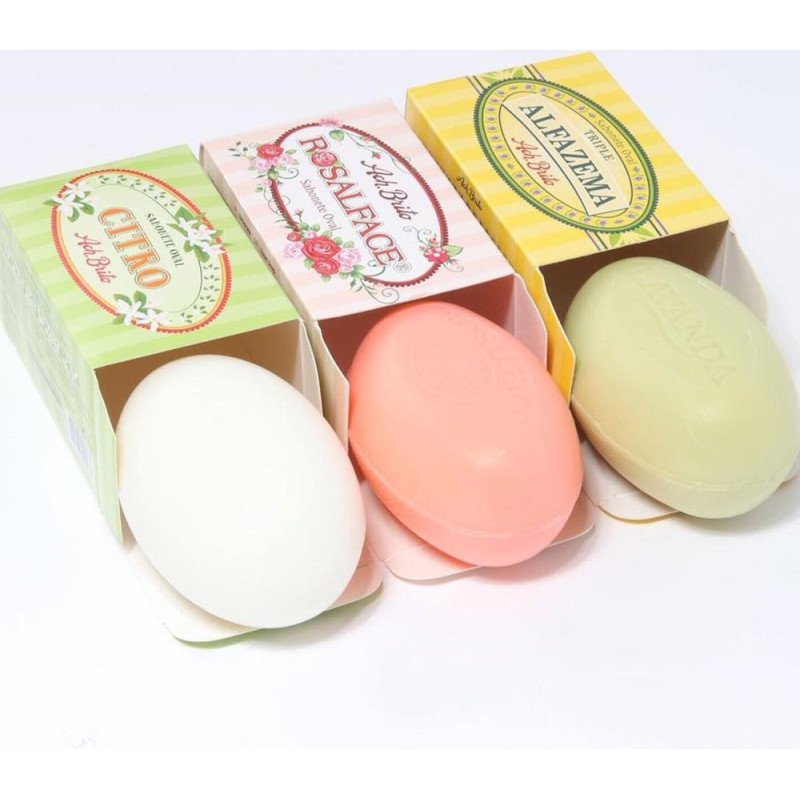 Pebble-shaped soap based on vegetable soap, with a soft texture that leaves the skin fragrant. Suitable for all skin types. Capacity up to 150g. Environmentally friendly soap. Packaging with classic illustrations.Colour 102: Rosafalce soapColour 108: Triple Alfazema soapColour 119: Citrus soap 90 x 58 x 45 mm