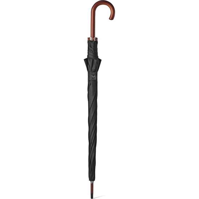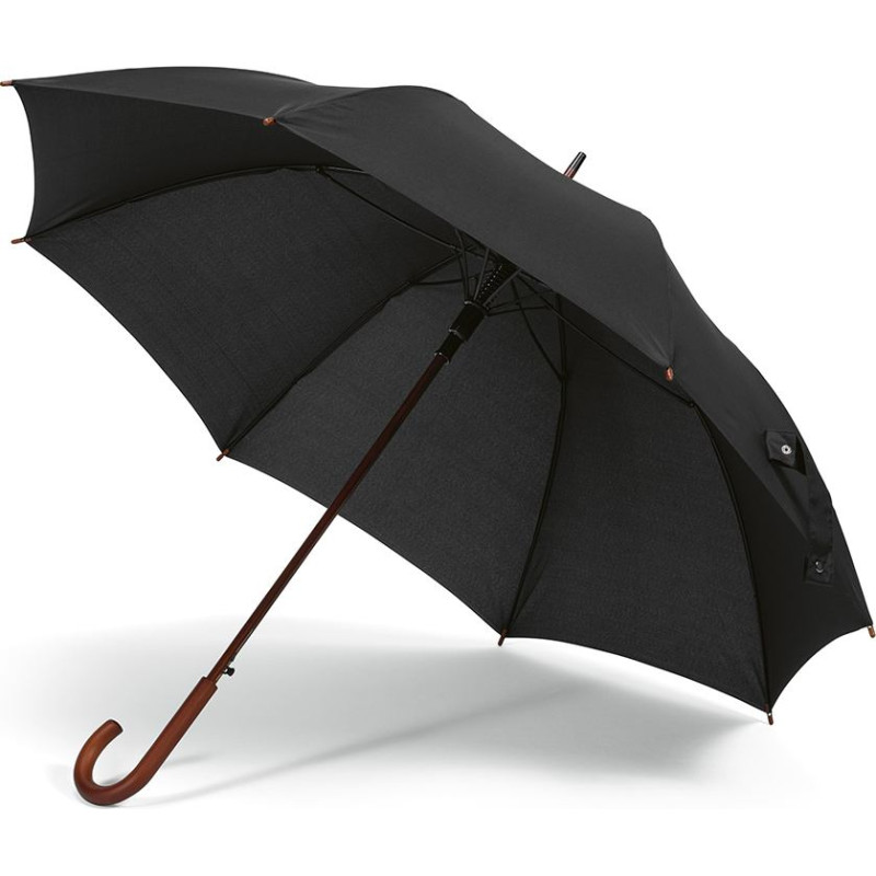 Bach 27'' umbrella with wooden handle and automatic opening. Featuring 8 panels and eco-friendly rPET fabric. Windproof frame in fibreglass. Comes in an individual rPET pouch.