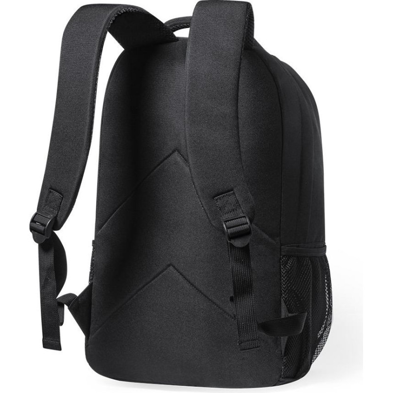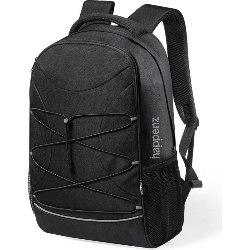 Nature line, padded urban backpack in durable 600D RPET, made from recycled plastic, to promote the reuse of plastic waste and contribute to the sustainability of the planet. Zippered main pocket with reflective strip and outside compartment with elastic straps and adjuster. Mesh side pockets and inside padded pocket for laptops up to 15 inches and tablets up to 12'. Adjustable padded shoulder straps with reinforced, padded carry handle. RPET emblem on outer label.
