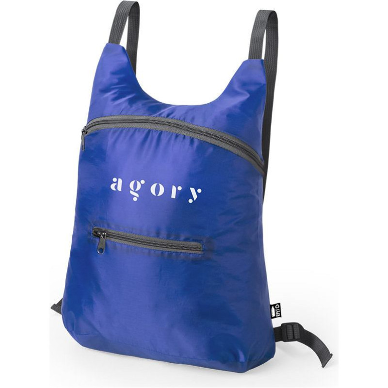 Foldable backpack in soft 201D RPET polyester, made from recycled plastic, to promote the reuse of plastic waste and help the sustainability of the planet. With zip closure and front pocket. Reinforced corners, adjustable shoulder straps and accessories in grey tones. Small folding size, with carrying strap. Available in a wide range of colours, with RPET emblem on outside label.