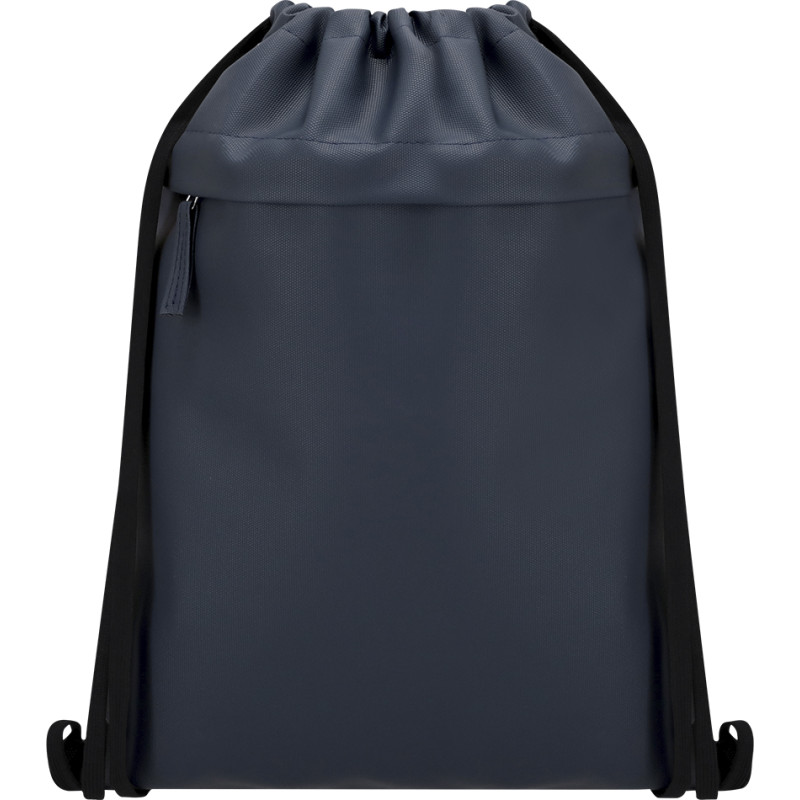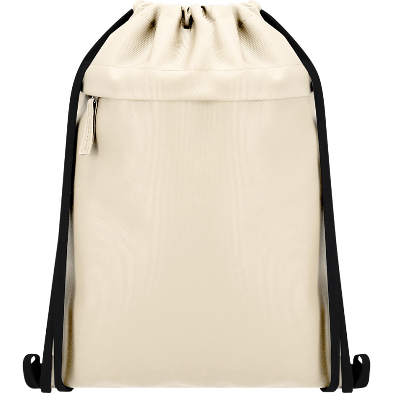 Drawstring backpack made of soft PU combined with durable 600D polyester. Features a functional front pocket with zipper closure and matching PU puller.