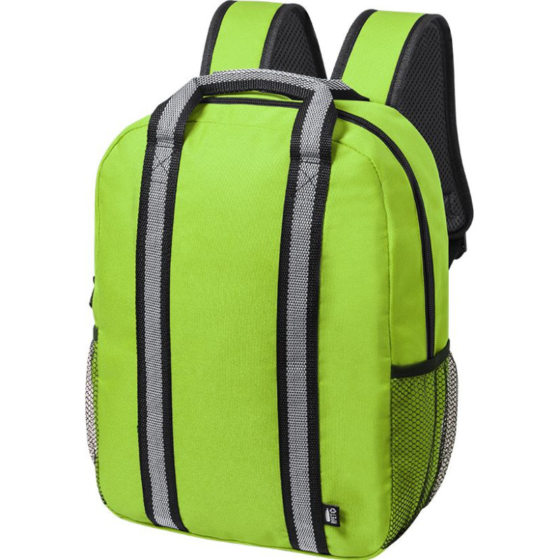 Nature line backpack in resistant 600D RPET, made from recycled plastic to encourage the reuse of plastic waste and contribute to the sustainability of the planet. With reflective strips and available in a wide range of colours. Zippered main compartment and easily accessible side mesh pocket. Padded back and shoulder straps, RPET distinctive on outside label.