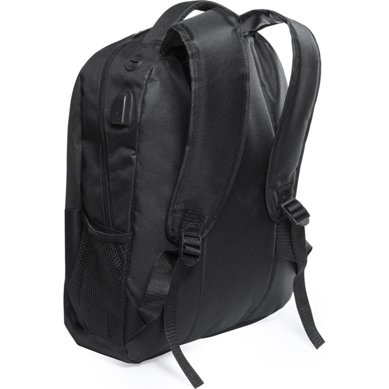 Resistant 600D polyester backpack in stylish black waterproof finish, with headphones output. With inside compartment with USB port for powerbank connection (not included). Inside with padded compartment for laptops up to 15 inches and tablets up to 10 inches. With a wide range of inside and outside pockets. Shoulder and back straps with ergonomic padding.