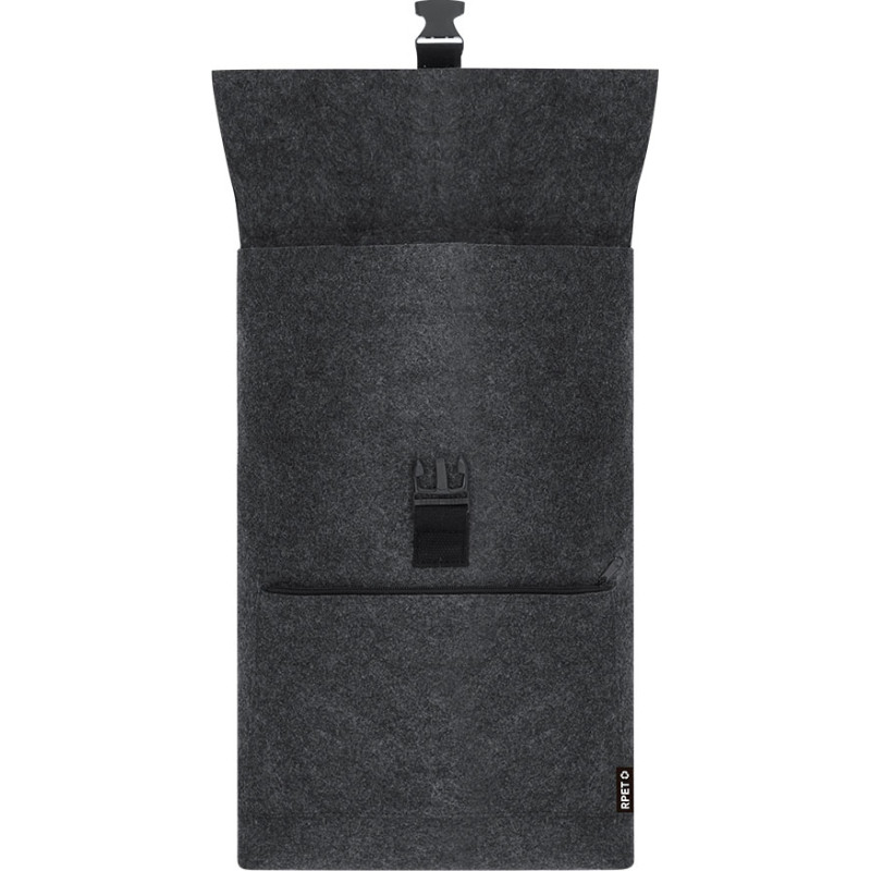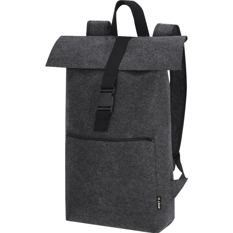 RPET felt backpack. Features a main pocket with a buckle closure and an additional front pocket with a zipper closure. Equipped with adjustable and reinforced shoulder straps and a top handle. Includes RPET label on the outer tag.RPET felt is the result of combining the recycling process of plastic materials with the ancient technique of felt making, resulting in an eco-friendly material that, in addition to being recycled, is also recyclable.