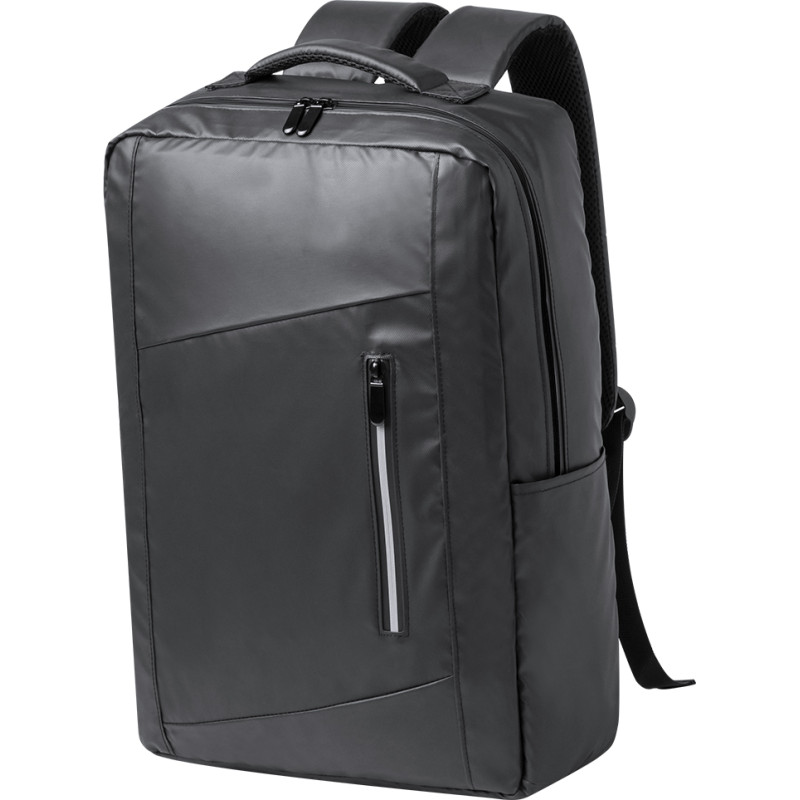 Backpack crafted in stylish PU leather. Characterised by an urban design featuring a padded pocket for tablets up to 10 inches and laptops up to 15 inches. It also features a front pocket enhanced by a reflective band. Back and shoulder straps are padded, adjustable and made of breathable fabric on the inside. Trolley fitting and a comfortable padded top handle included. Presented in an individual Recycled bag.