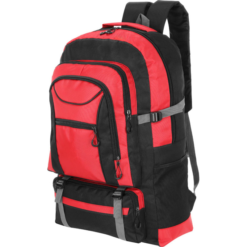 Backpack made from durable 600D polyester. With main compartment with double zipper closure and inner lining, multiple front pockets with zipper closures and comfortable wide-grip pulls. Includes mesh side pockets. Padded back, adjustable and padded shoulder straps, as well as an adjustable waist strap.