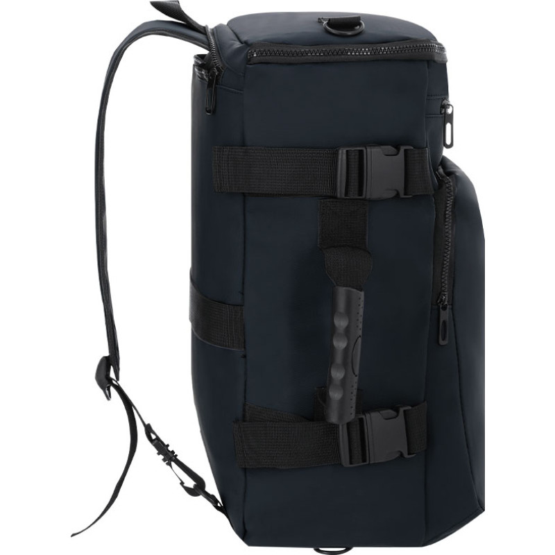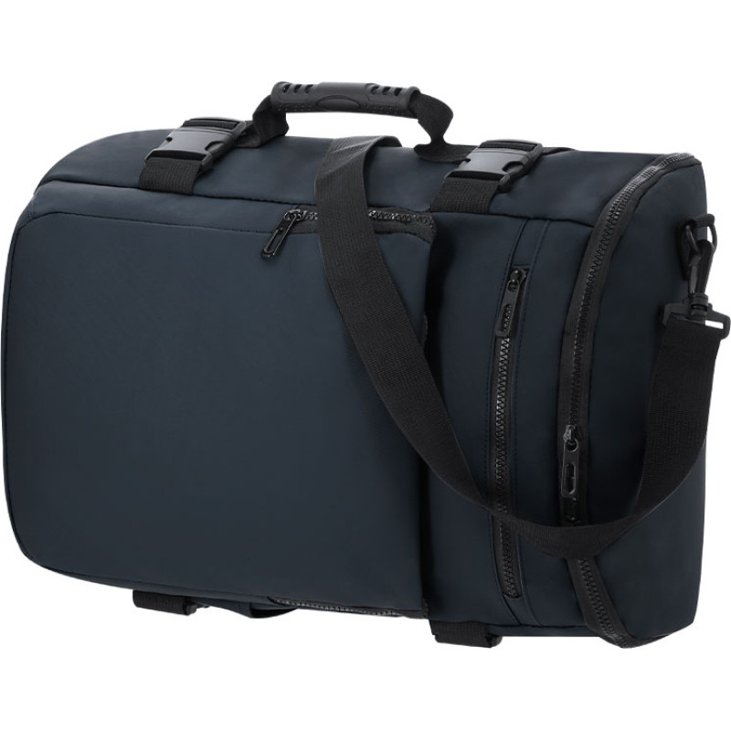 Document holder backpack made from PU. Features an urban design that includes a central pocket with zipper closure and double pull. With padded interior for laptops up to 15 inches, additional interior pocket with zipper closure, and two pockets on the front. Its shoulder straps and back are padded and adjustable for added comfort. Includes side straps allowing for thickness adjustment to make it compact. Offers three modes of carrying: as a backpack, thanks to the padded shoulder straps and compartment for storing them; as a document holder, thanks to its padded transport handle; and as a messenger bag due to its long adjustable strap.