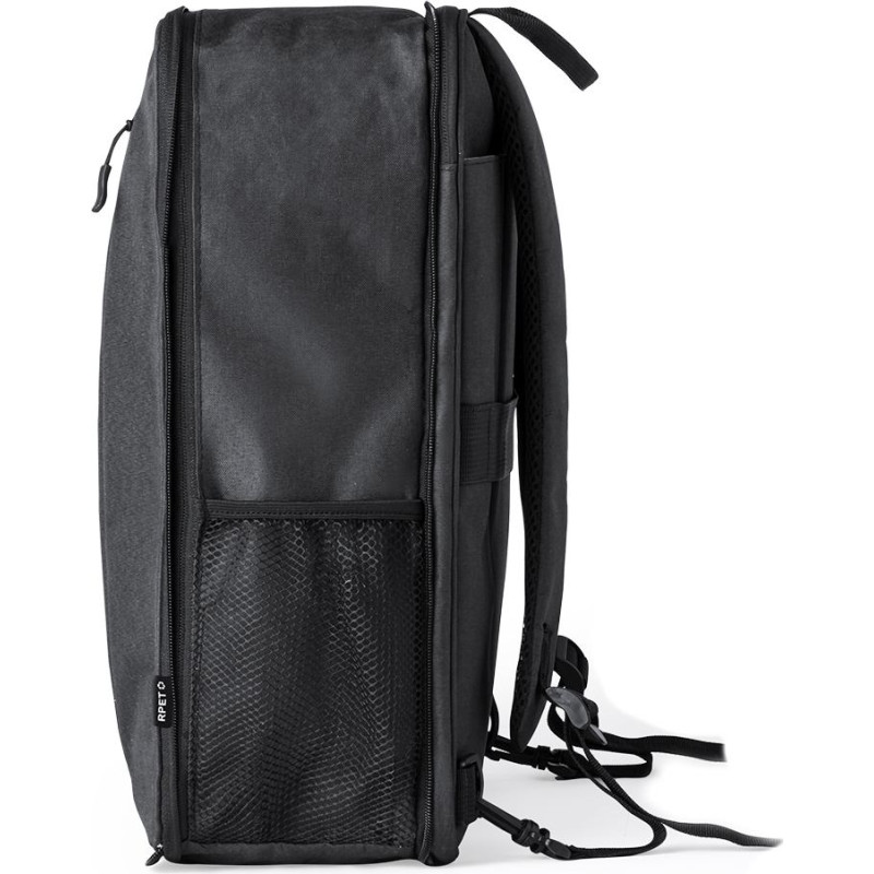 Extendable backpack made of resistant 600D RPET. Equipped with double pull zip closure, with the option to expand the capacity. Inside, it has padded compartments designed for tablets up to 10 inches laptops up to 15 inches. The shoulder straps are padded, adjustable and removable, and can be stored in the back pocket. The backpack includes a strap for luggage fitting and a top handle for easy carrying. RPET badge on label. Presented in an individual Recycled bag. RPET material is made from recycled plastic to encourage the reuse of plastic waste and help the sustainability of the planet.