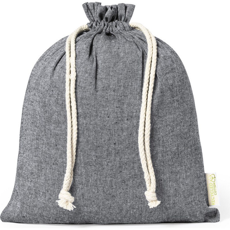 Eco-friendly bag in resistant recycled cotton material of 120g/m2. GRS (Global Recycled Standard) certification, guaranteing the recycled origin of the material used to manufacture the product. Cotton drawstring closure and stitched finish, including outside label with recycled cotton logo.