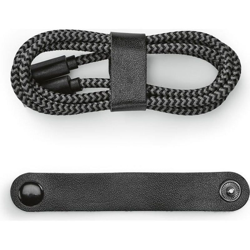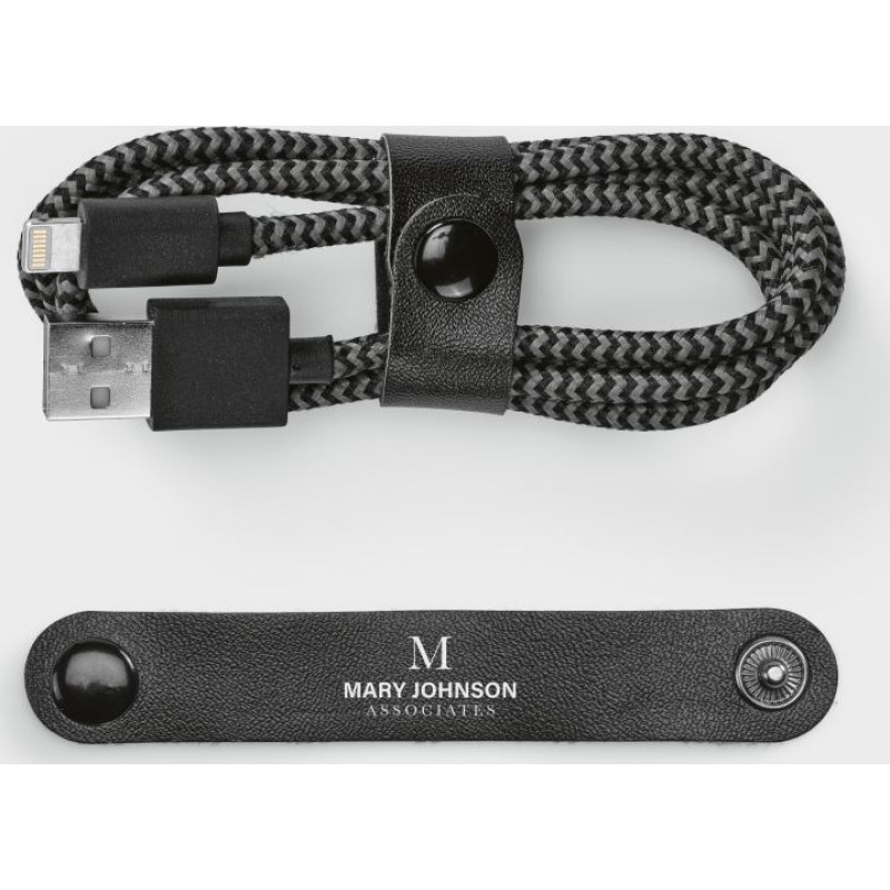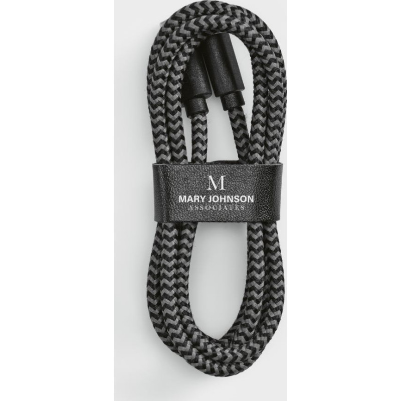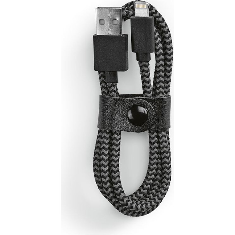 Bernoulli fast charging cable. 1m in rPET, designed to simplify and accelerate your digital life. It connects USB-A to Lightning. Provided with a strap to secure the cable. Each unit packed in its own kraft pouch.