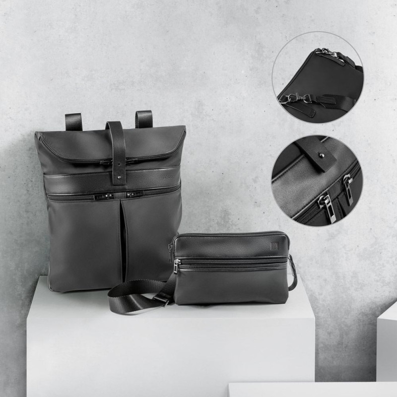 Versatile microfibre backpack with a PU bottom that allows it to be cleaned easily. Inside there is a compartment and an accessory pouch with a detachable strap that can be worn in different ways: on the shoulder, shoulder strap or waist strap. Capacity up to 12 litres. Supplied in a non-woven bag. Product includes Quality Test Report. Open: 300 x 415 x 110 mm | Closed: 300 x 330 x 110 mm | Pouch: 225 x 135 x 20 mm | Non-woven bag: 500 x 500 x 80 mm