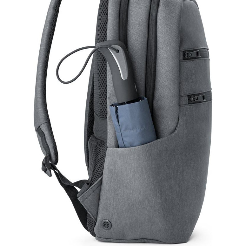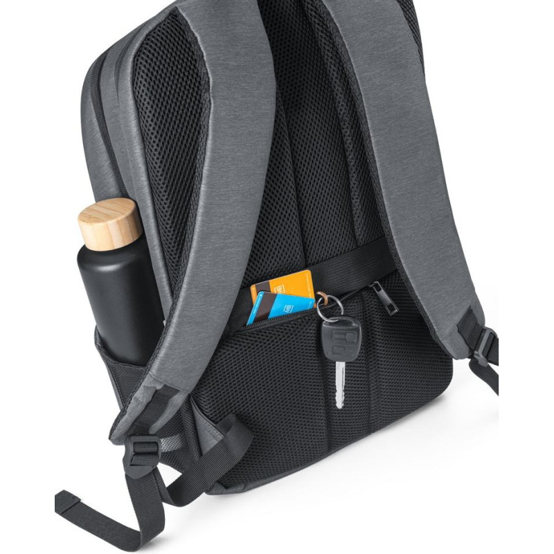 Waterproof 2 Tone Nylon computer backpack with padded shoulder straps. Featuring 2 compartments with padded dividers for computers up to 15'' and tablets up to 10'5'' and a self-adhesive hook and loop fastener. Front compartment with several interior pockets. Two pockets on the front, one of which has RFID protection. A bottle pocket on the side in spandex and opposite another for an umbrella which has mesh eyelets to prevent water accumulation. The padded back has a hidden pocket and trolley band. Capacity up to 14 L. 320 x 450 x 140 mm