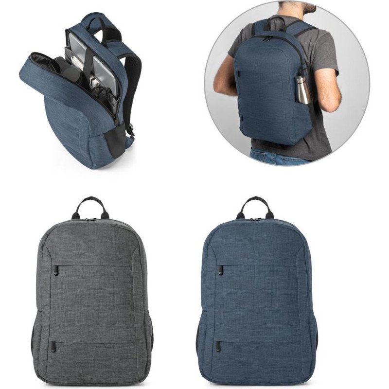 Laptop backpack in 300D recycled polyester, with 210D recycled polyester lining. Padded main compartment with divider for laptop up to 15'6" and tablet up to 10'1". Backpack with 2 zipped front pockets and 2 mesh side pockets. The back incorporates a trolley strap in case you need it. Capacity up to 18 litres. 300 x 450 x 140 mm
