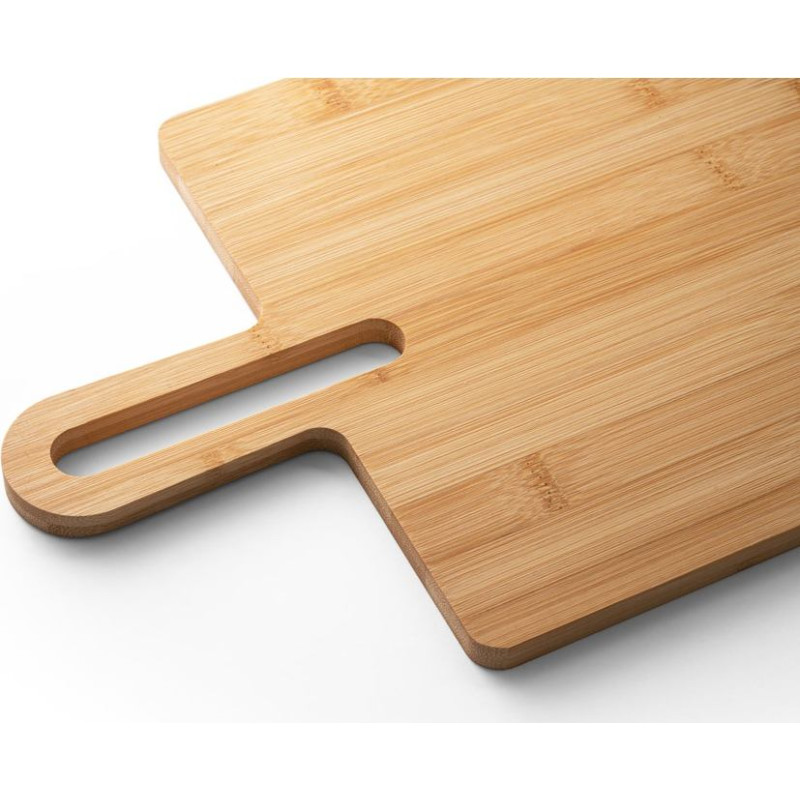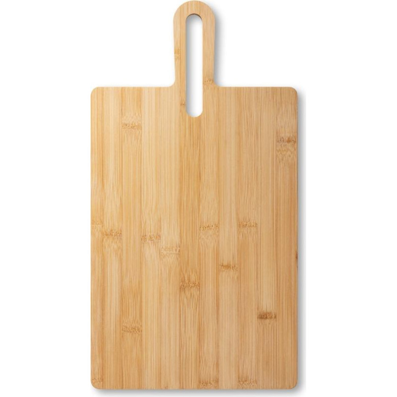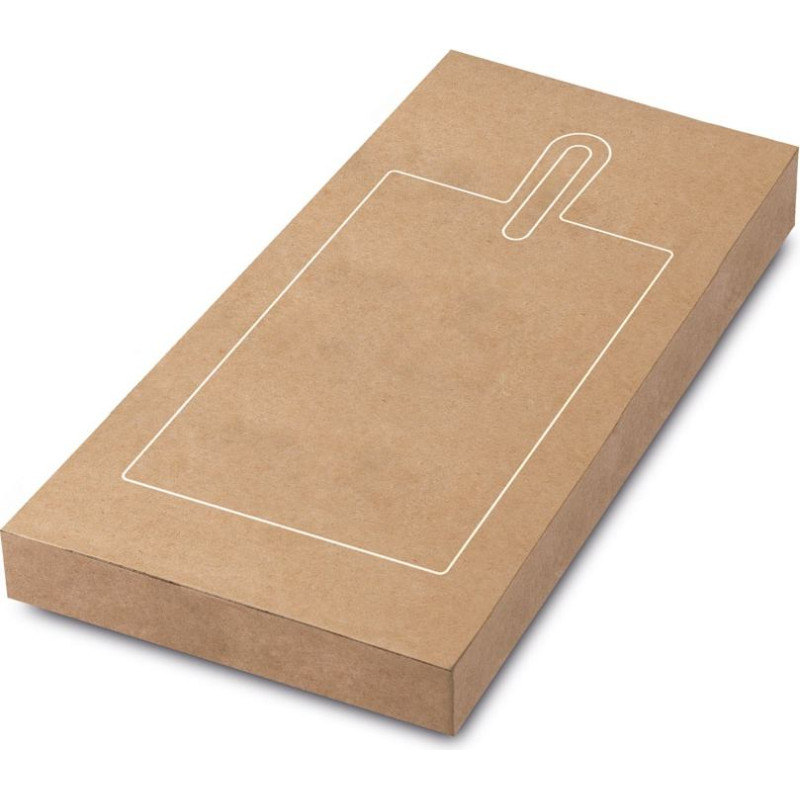 Large bamboo serving board with handle, very versatile. Supplied with a kraft gift box. As the product is made from natural materials, the colour and the printing result may vary between products. 450 x 240 x 12 mm