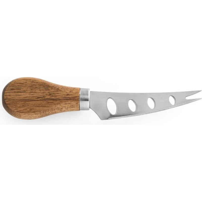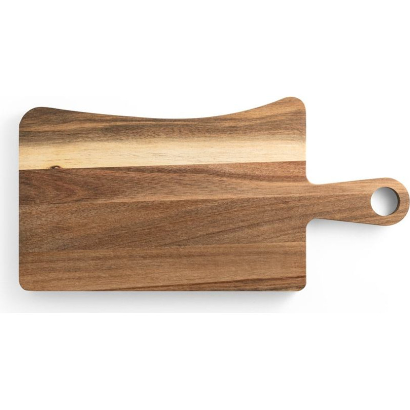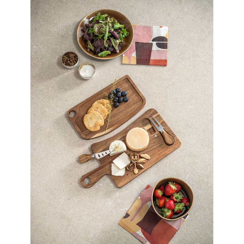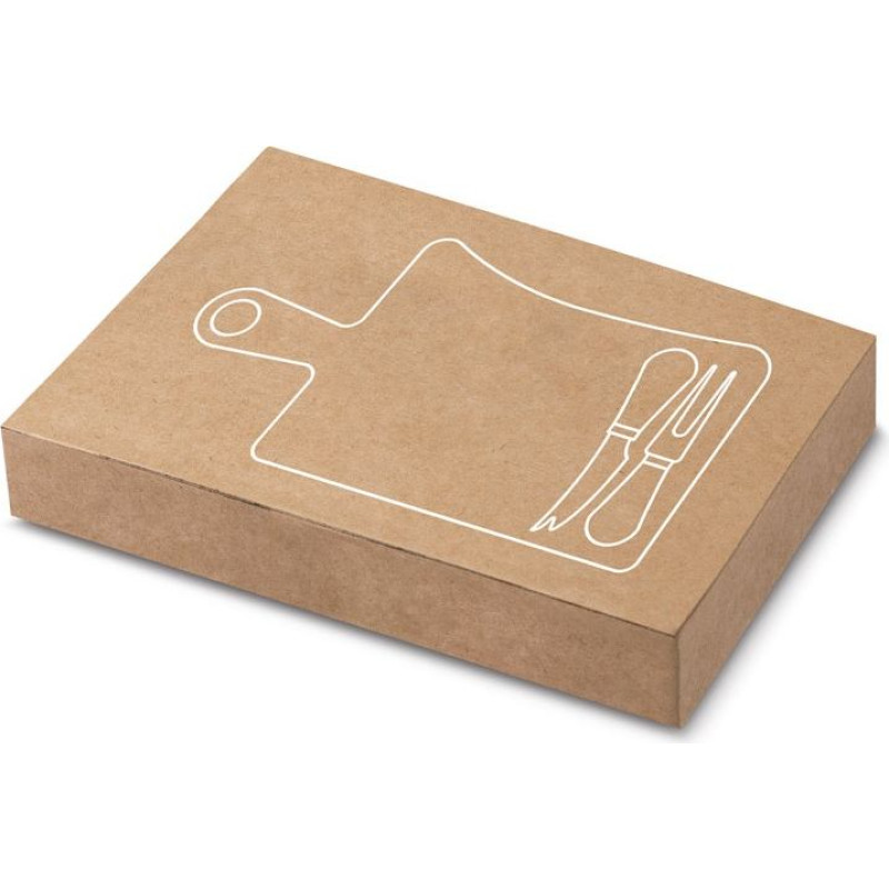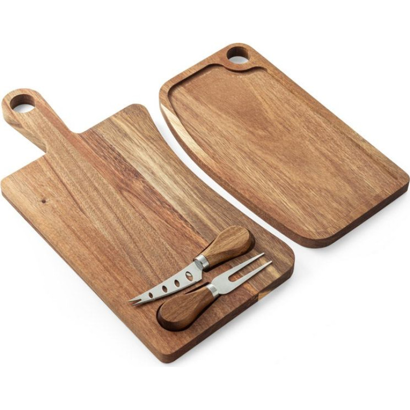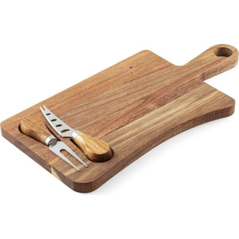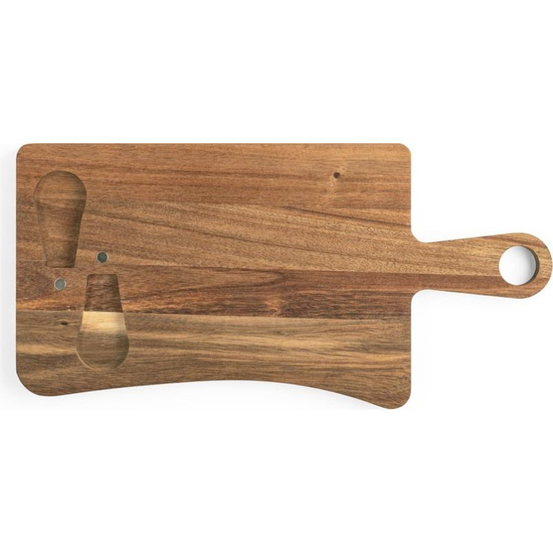 Acacia wood cheese board with handle, made from FSC™ certified material and other controlled materials. Includes 2 utensils in acacia wood and stainless steel: a knife and a fork, with a magnetised slot to hold the cutlery. Combine this board with the Caper - 94289 - to complete the set. Supplied with a kraft gift box. As the product is made from natural materials, the colour and the printing result may vary between products. 363 x 181 x 15 mm