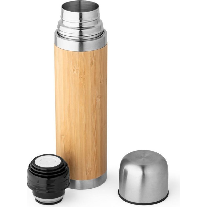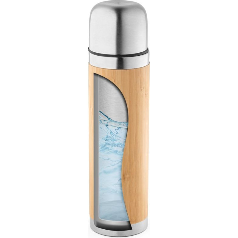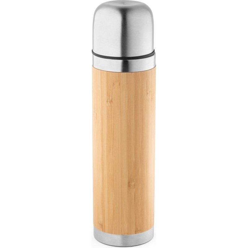 Bamboo and stainless steel vacuum-insulated double-walled thermos. The bottle has a capacity of up to 450 mL and keeps drinks hot for 12 hours and cold for 24 hours. Supplied in a kraft paper gift box. As the product is made from natural materials, the colour and the printing result may vary between products. ø63 x 251 mm