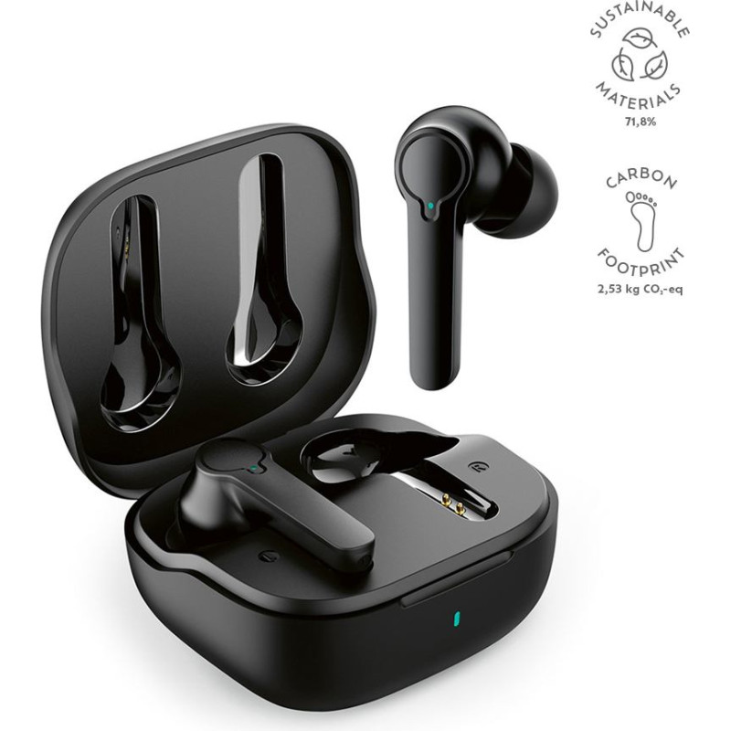 Chadwick earbuds with a recycled rABS body, these earbuds feature ANC and water resistance IPX4. LED indicators display charging level. USB-C connection ensures convenience. Benefit from 8 hours of playing time with the 500mAh battery. Built-in microphone for hands-free calls. Individually packed inside a kraft box.