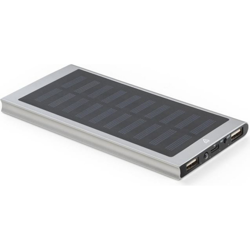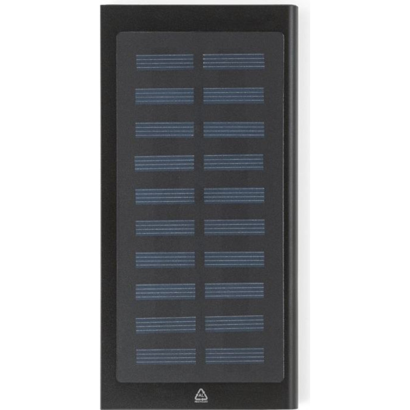 Power bank with solar panel, torch and charge level indicator. Ideal for emergency situations, both for its ability to charge the battery using sunlight and for its built-in LED torch.Material: recycled aluminium (100% rAL) | Capacity: 8.000 mAh | Charging power: | Input: USB-C | Outputs: 2x USB-A | Includes: USB-C charging cable | Supplied: gift box made from recycled kraft paper 10 x 153 x 74 mm