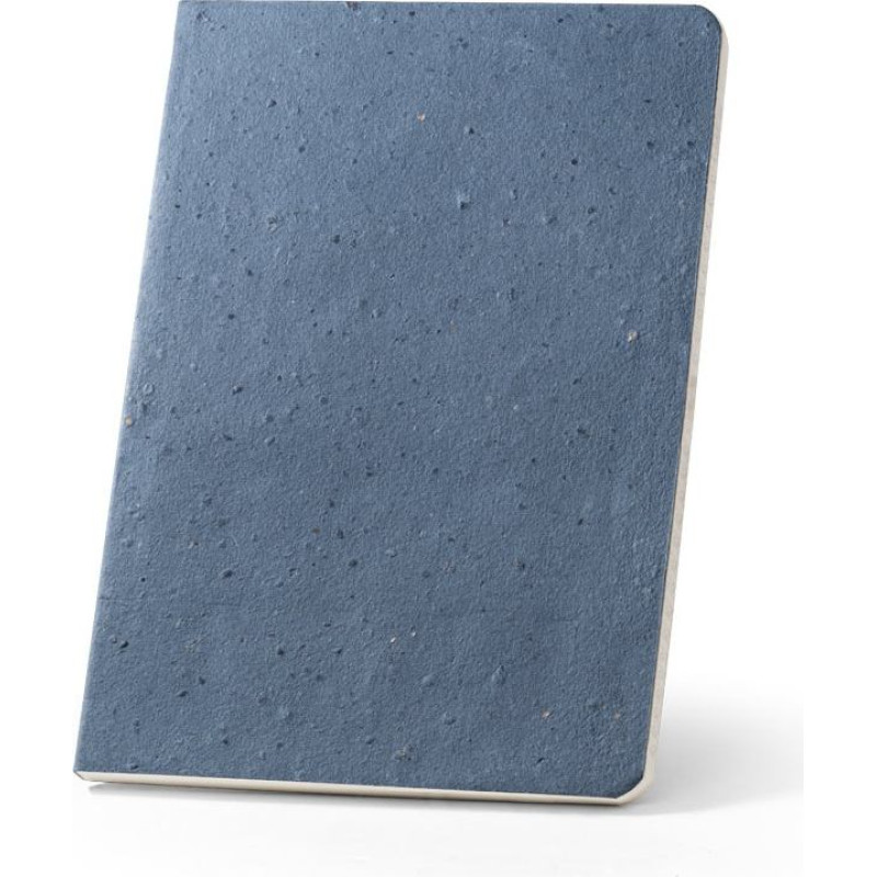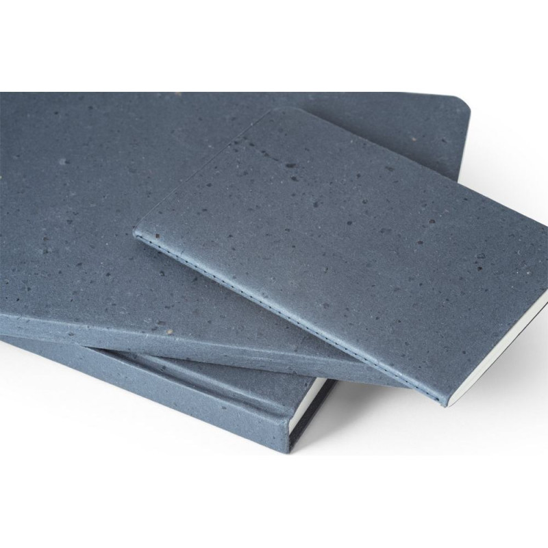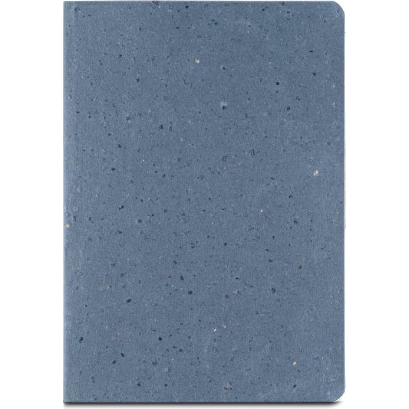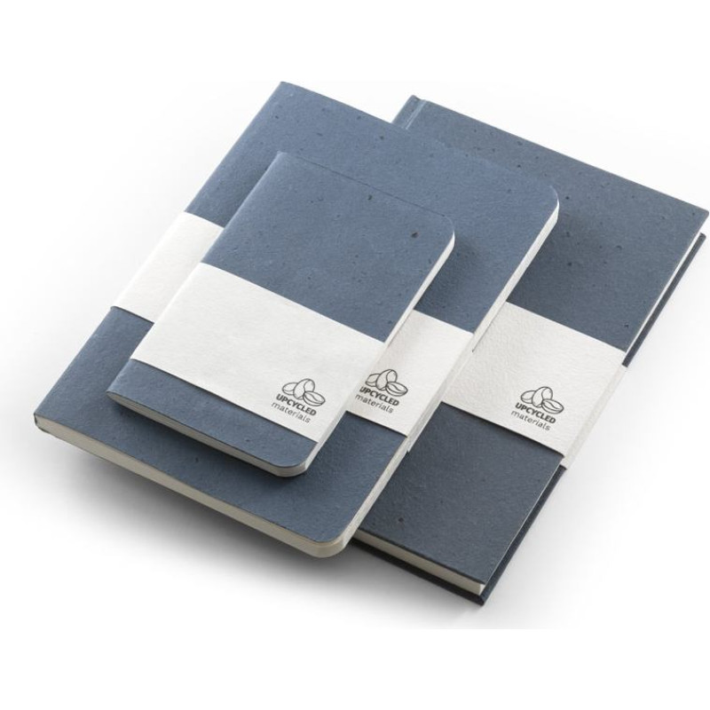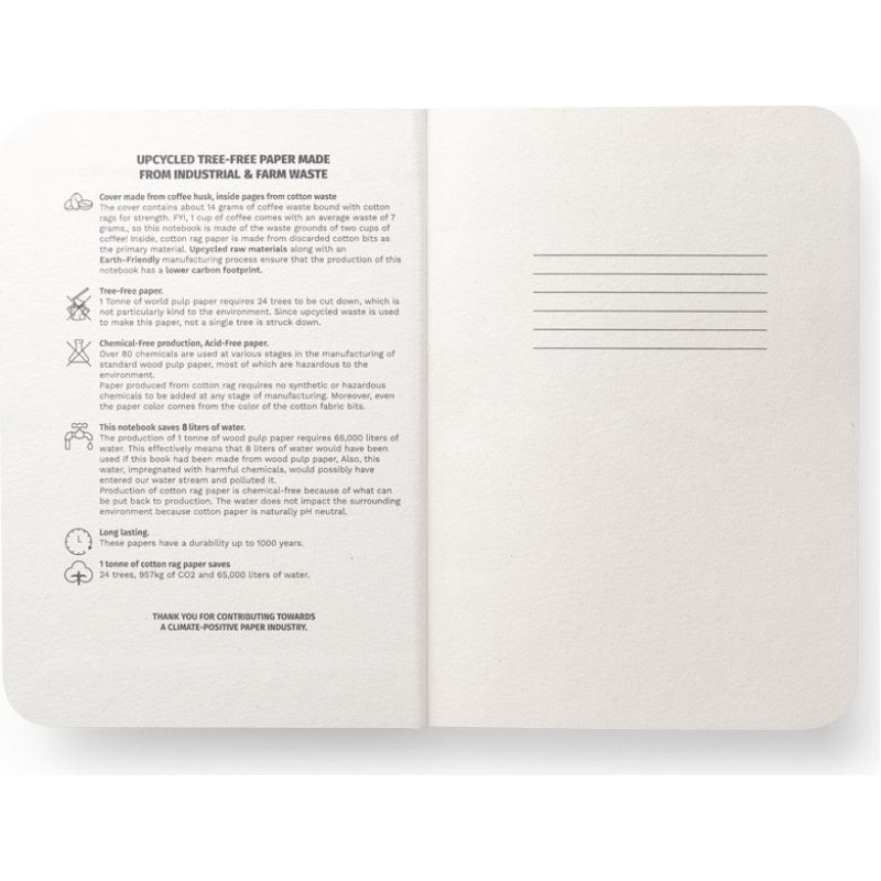A5 notepad with semi-rigid cover made from coffee husk waste (65%) and cotton waste (35%). The inner paper is made from cotton (100%) waste and is highly durable. Contains 100 lined pages and paper band with artwork. No waste was generated and no chemicals or trees were used in the manufacturing process of this notebook. As the product is made from natural materials, the colour and the printing result may vary between products. 140 x 200 mm