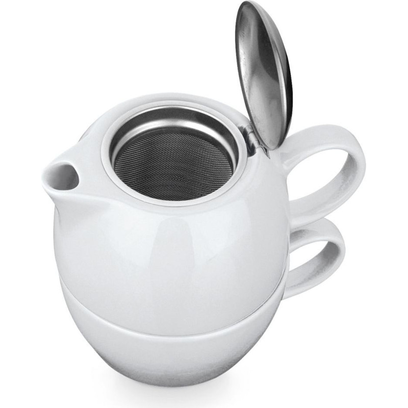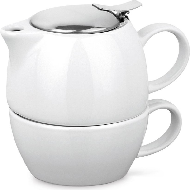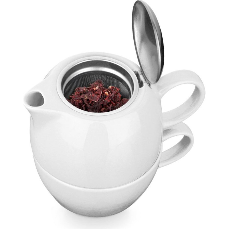 2 in 1 porcelain tea set. The set includes a teapot with stainless steel strainer (440 mL) and a mug with capacity up to 280 mL. Supplied in a gift box. ø113 x 140 mm