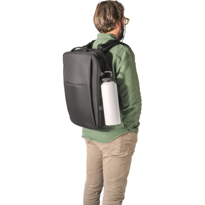 Travelling backpack in high-density 600D recycled polyester. It has 3 main compartments with 210D recycled polyester lining: a rear compartment with a pocket for a laptop up to 17'3" and a pocket for a tablet up to 10'1", an expandable central compartment with a zip for storing clothes and a front compartment with several interior pockets. It also has three front pockets, two of them with PEVA lining in different sizes, ideal for putting your bottle and wet clothes or cosmetics in. In addition to these features, it has other specific characteristics such as: adjustment straps that make this rucksack more comfortable, compression straps on the sides, padded top and side handles. The back incorporates a trolley strap in case you need it. Capacity up to 29 L. Expanded: 320 x 460 x 200mm | Compact: 320 x 460 x 110 mm