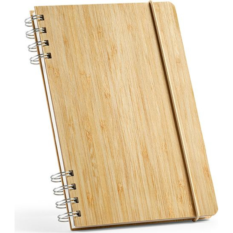 Dante A5 notebook with a bamboo cover. With 196 recycled 70gsm dotted pages, with an entry space for date and page number, a thin vertical elastic and unique spirals designed on the spine, it offers functional elegance. Supplied in an individual kraft sleeve.