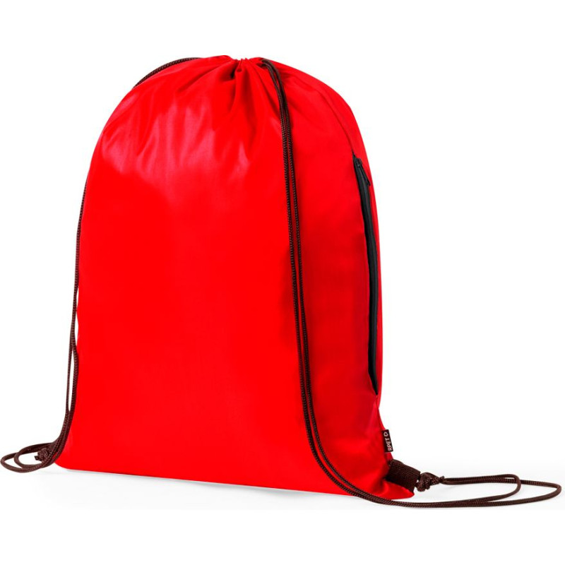 Drawstring backpack made of soft 210T RPET polyester. With self-closing strings, and including a side zipped pocket. RPET side label and available in a variety of colours (white color specially made for sublimation printing).RPET material is made from recycled plastic, thus promoting the reuse of plastic waste and helping the sustainability of the planet.