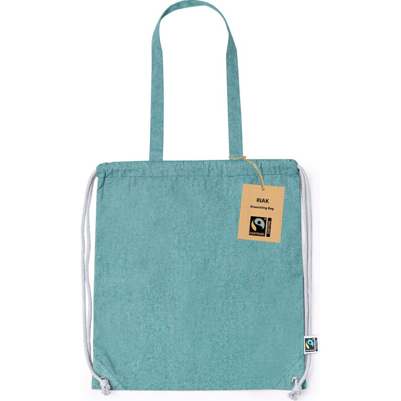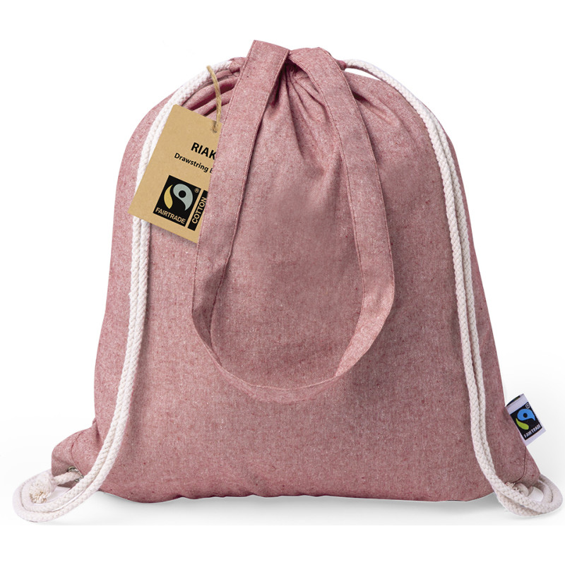 Fairtrade line drawstring backpack, made of cotton 140g/m2. Stitched finish, with natural colour cotton strings and reinforced with metal eyelets. Including carry handles. and available in a variety of colors. Recycled cotton label and resistance up to 8 kg in weight. With Fairtrade certification, an alternative to the conventional trade system that pursues the development of peoples and the fight against poverty.