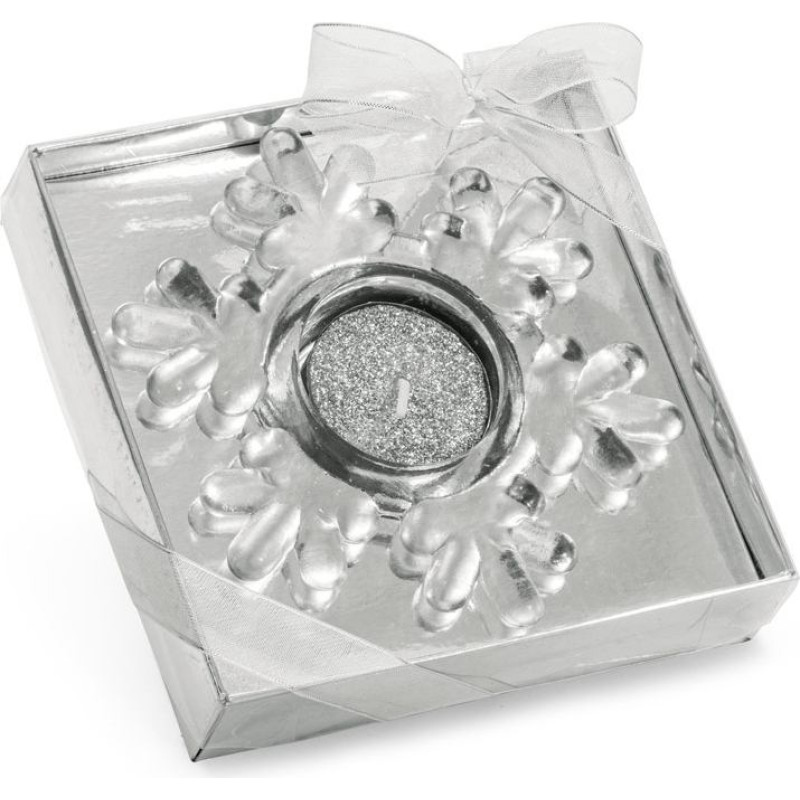 Candle in snowflake-shaped glass base. Gift box included. 123x123x30 mm