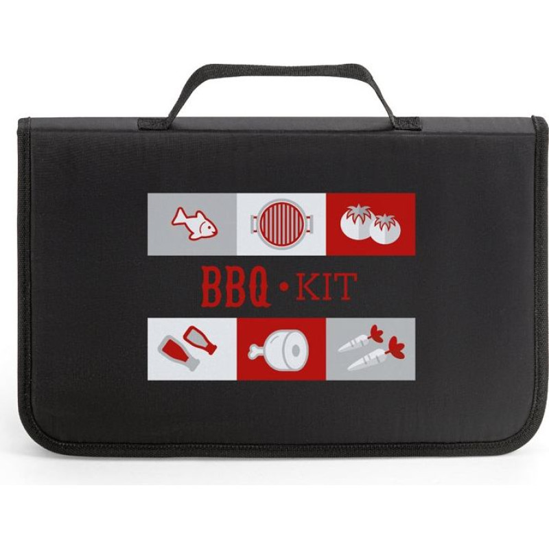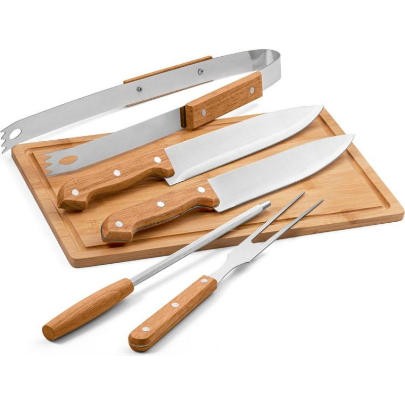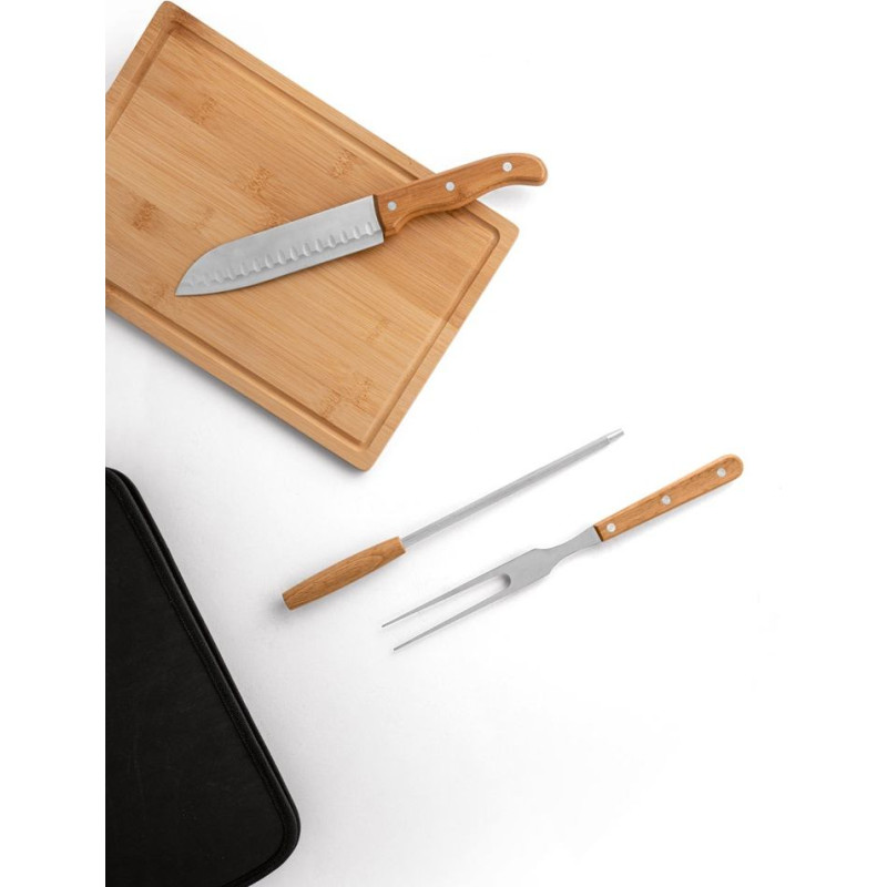 Five-piece wooden and stainless steel barbecue set with bamboo board. Kit with 5 utensils and board, supplied with a 210D hard case. As the product is made from natural materials, the colour and the printing result may vary between products. Tray: 300 x 200 x 12 mm | Bag: 350 x 230 x 40 mm