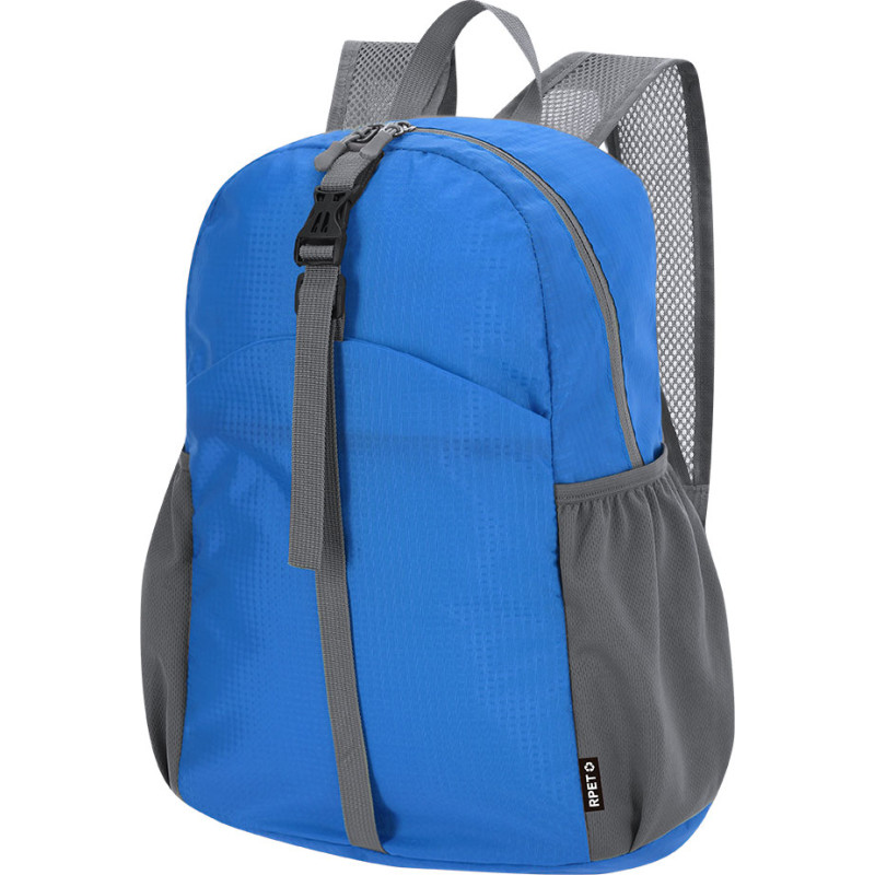 Foldable backpack made of soft RPET Ripstop 210D polyester. Main pocket with double drawstring closure, dual-function inner pocket, and front pocket with clip closure. Reinforced corners with mesh, adjustable shoulder straps, and gray accessories. Small size when folded, with a transport handle. RPET emblem on the tag.RPET material is made from recycled plastic, promoting the reuse of plastic waste and helping to sustain the planet.