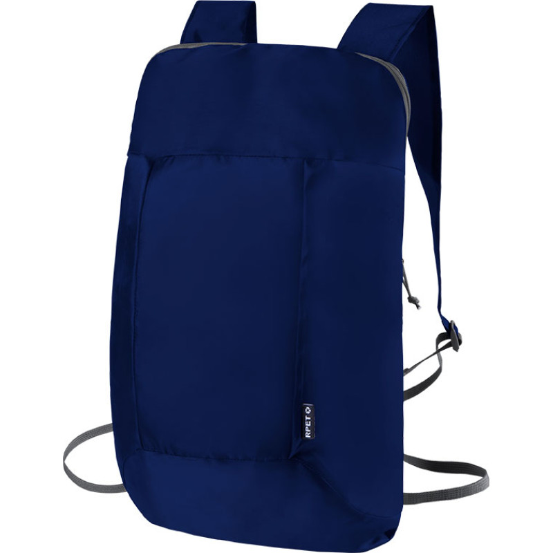 Folding backpack made of RPET 210D. With zipper closure, reinforced corners, adjustable shoulder straps. RPET label on the outer tag.RPET material is made from recycled plastic to promote the reuse of plastic waste and help the planet's sustainability.