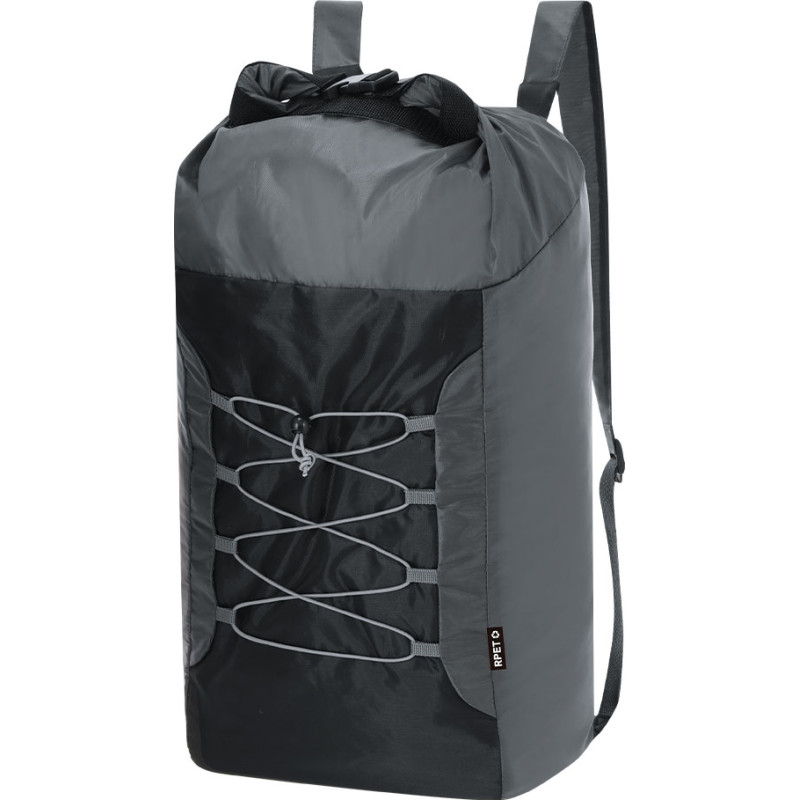 Foldable backpack made from durable RPET 210D and ripstop polyester. With loop closure on the main compartment, elastic cords, and adjustable shoulder straps.RPET material is made from recycled plastic to promote the reuse of plastic waste and help the sustainability of the planet.