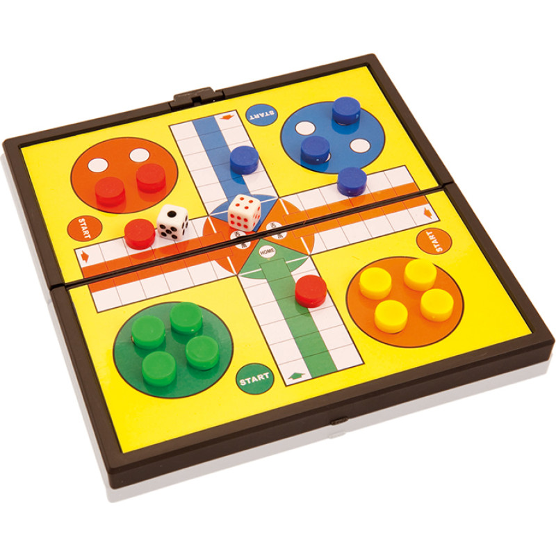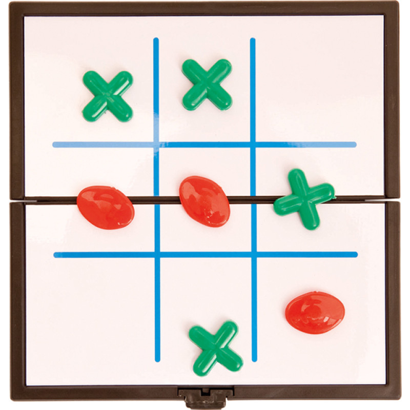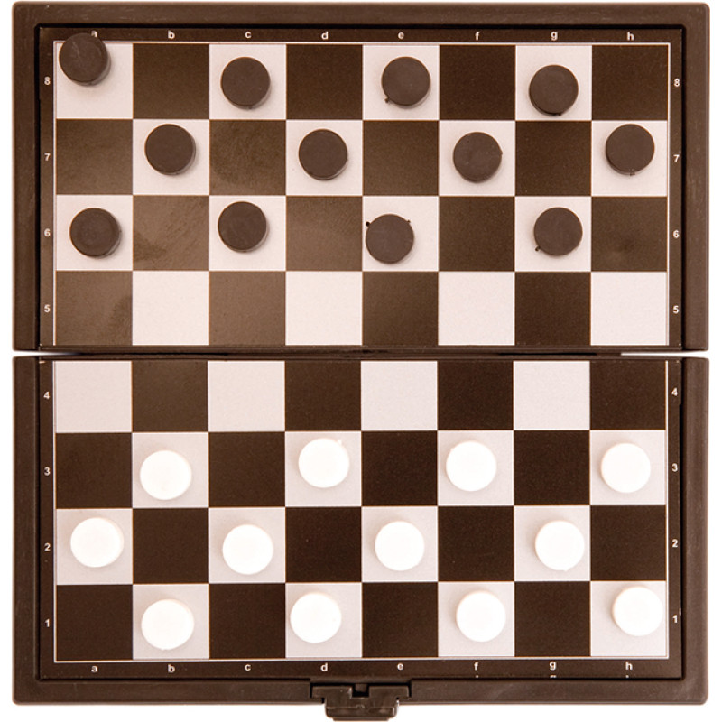 Folding table set with metal surface and magnetic counters. Available in parcheesi, tic-tac-toe and draughts design. Presented in an individual box.