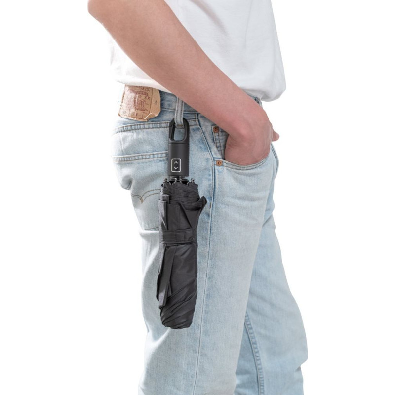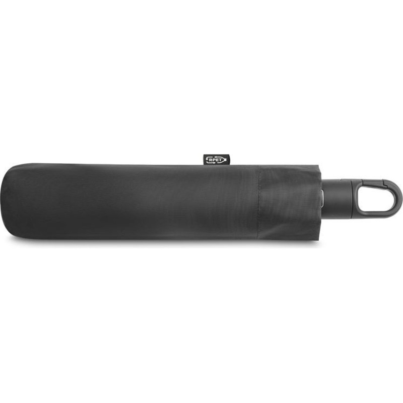 23'' foldable umbrella in recycled polyester (100% rPET) 190T pongee. Fibreglass ribs, metal shaft and handle in recycled ABS (35% recycled). The automatic opening and closing umbrella is also windproof, and is foldable in 3 sections. Supplied in bag. ø1050 x 330 mm | Pouch: ø50 x 250 mm