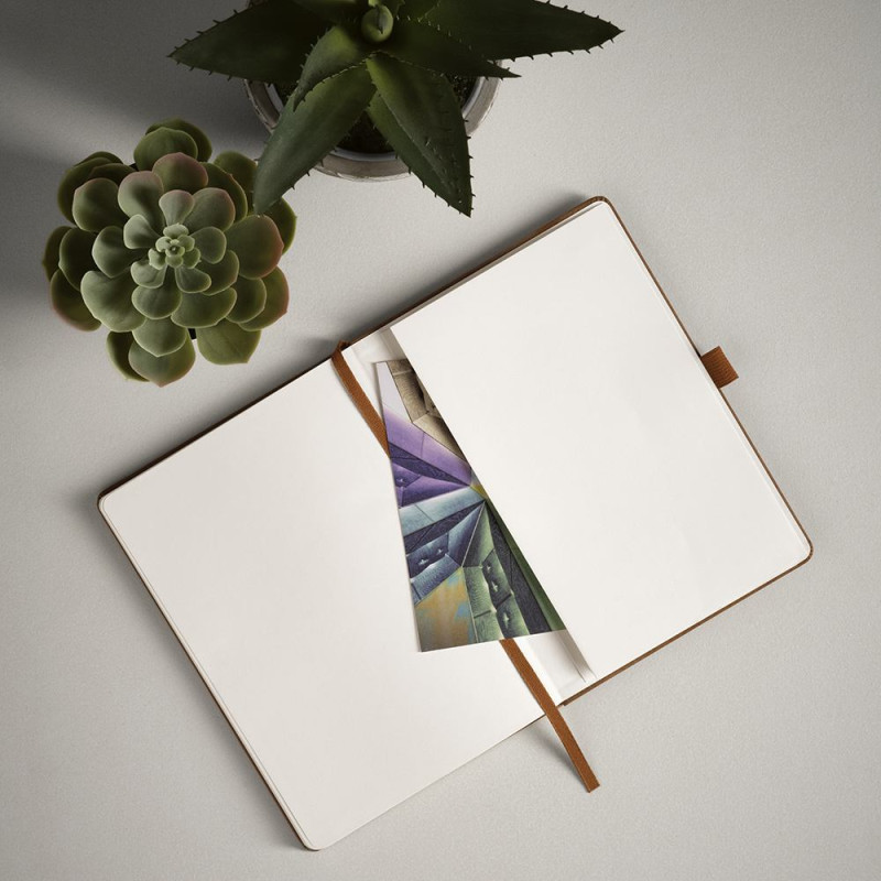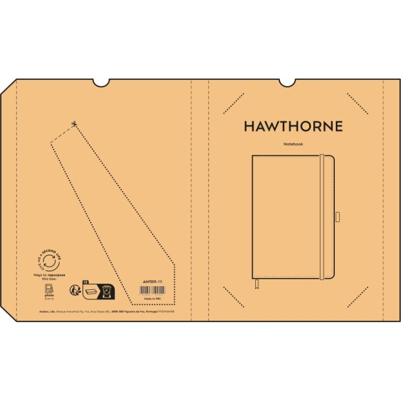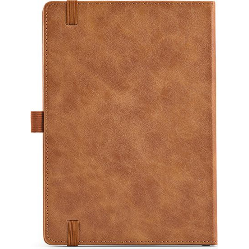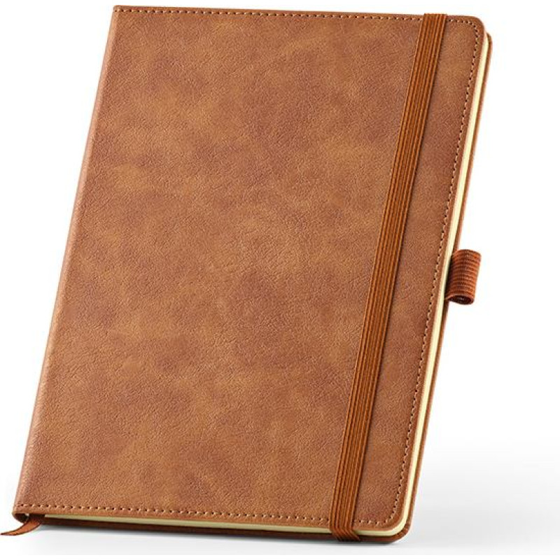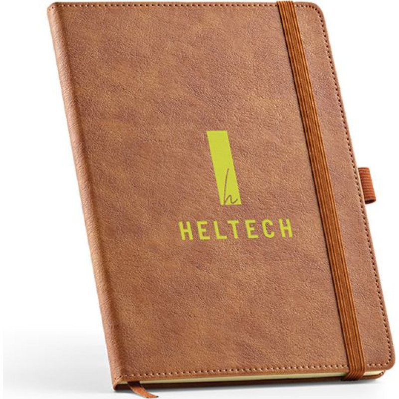 Howthorne A5 recycled PU notebook. It features 196 FSC 70gsm plain pages with a field to record the date and page number where creative space meets functionality. A vertical elastic, a pen holder and a matching ribbon. Supplied in an individual kraft sleeve.
