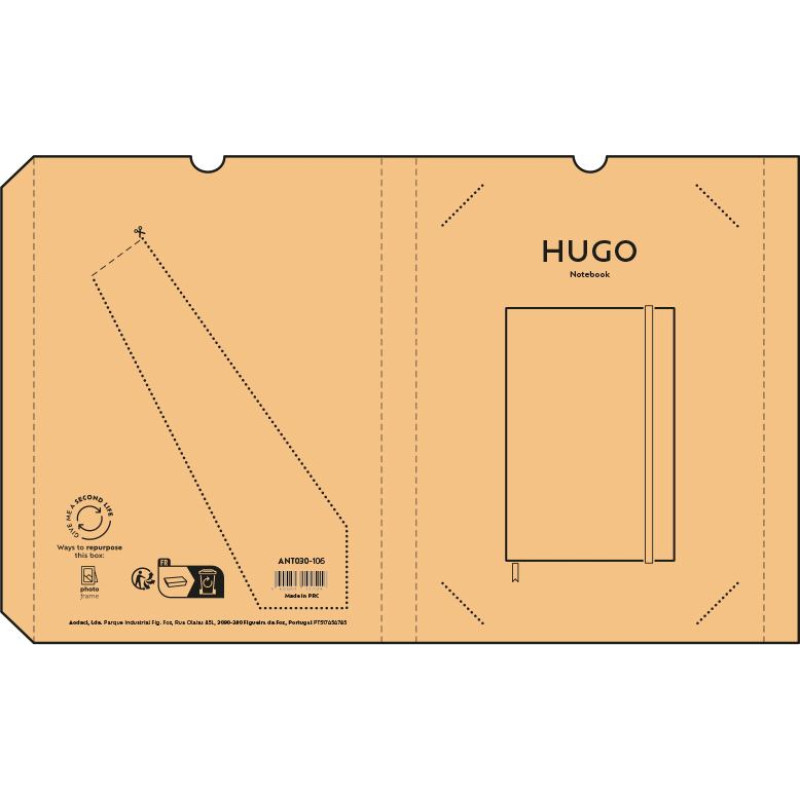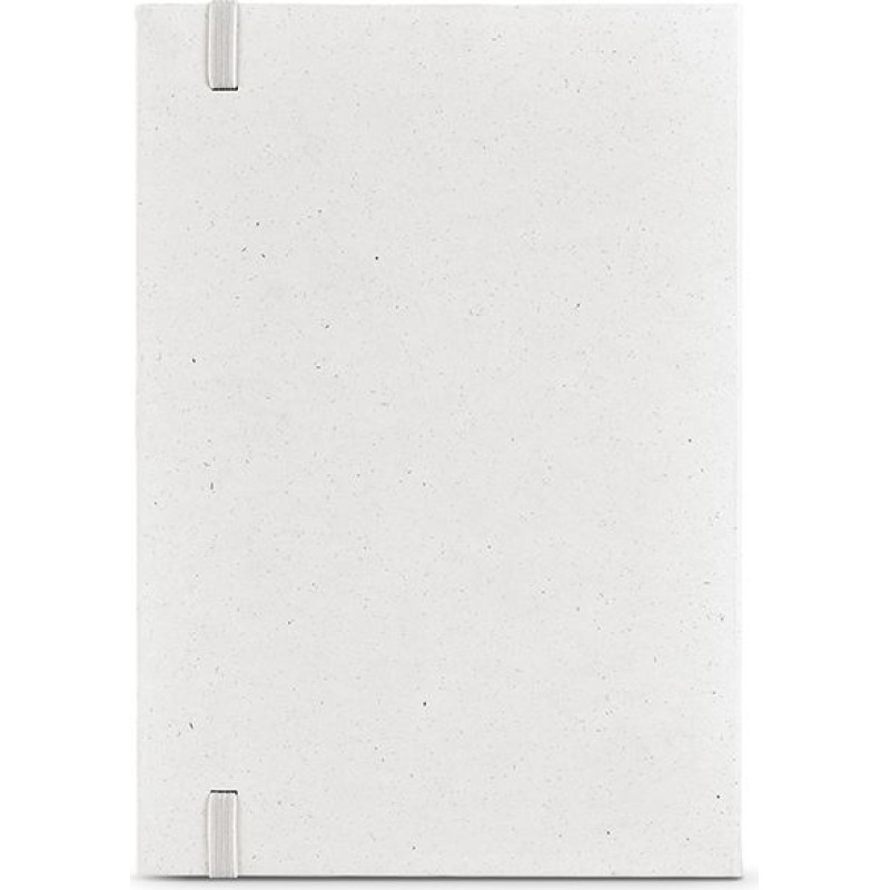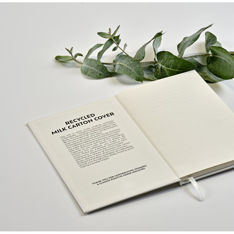 Hugo A5 hardcover notebook made from repurposed milk cartons. Contains 160 70gsm recycled dotted pages, a marked space for your date and page info, a closing elastic and a ribbon marker for your convenience. Embrace sustainable creativity! Supplied in an individual kraft sleeve.