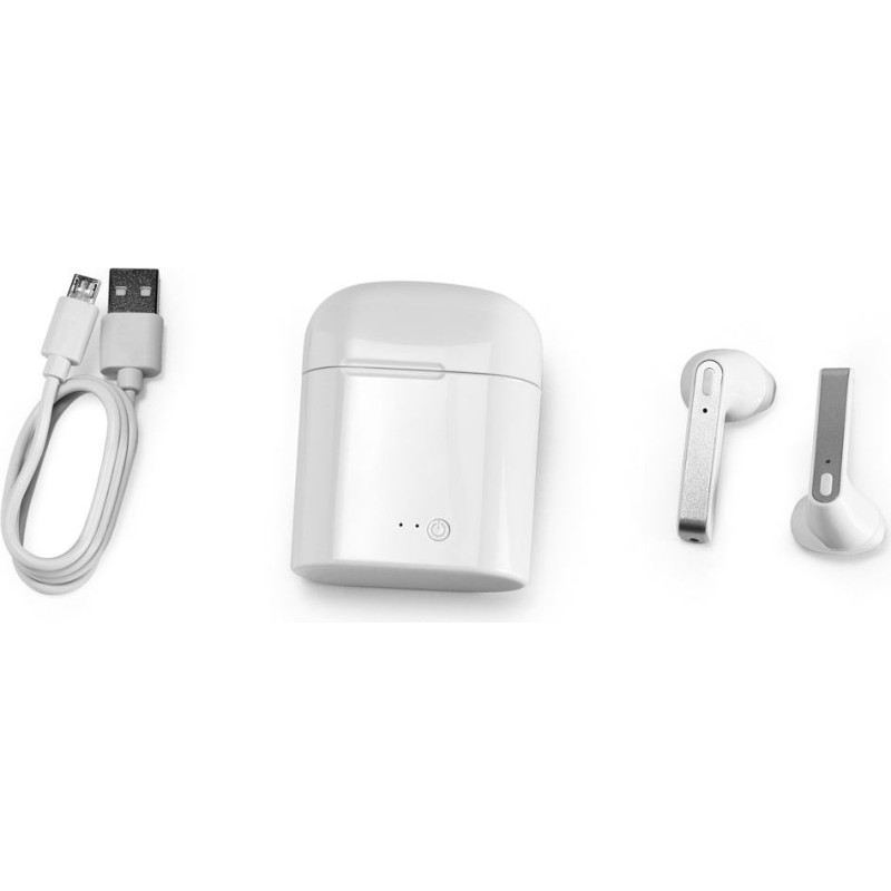 ABS wireless stereo earphones. BT transmission, with autonomy of up to 6 hours. Functions: answering calls, control volume and connect to the playlist of a mobile device. Includes USB charging cable. Supplied in a box with charger function. 71 x 55 x 28 mm | Headphone: 47 x 21 x 21 mm