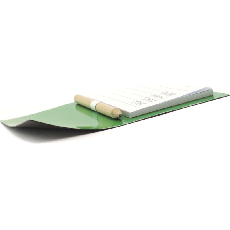 Magnet notepad in resistant cardboard of bright and varied colors. 40 sheets with striped design, with pencil and holder.