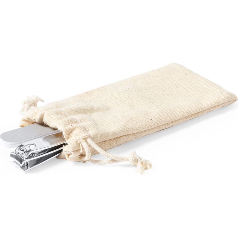 Manicure set with nail cutter and file. Presented in individual bag in natural cotton with string closure.