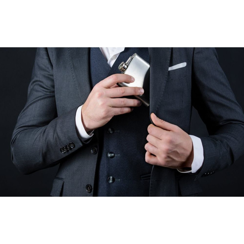 Set with stainless steel hip flask with volume-capacity 200 mL includes, funnel and 4 cups. Cup capacity 20 mL. Supplied in a gift box. 189 x 40 x 168 mm