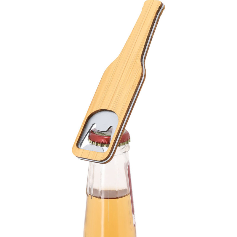 Bottle-shaped opener made of bamboo and metal.Materials like bamboo promote the use of natural raw materials, reducing pollutant emissions. Additionally, bamboo comes from a resilient and versatile plant, with fast growth and regeneration, making it an excellent alternative to traditional wood.