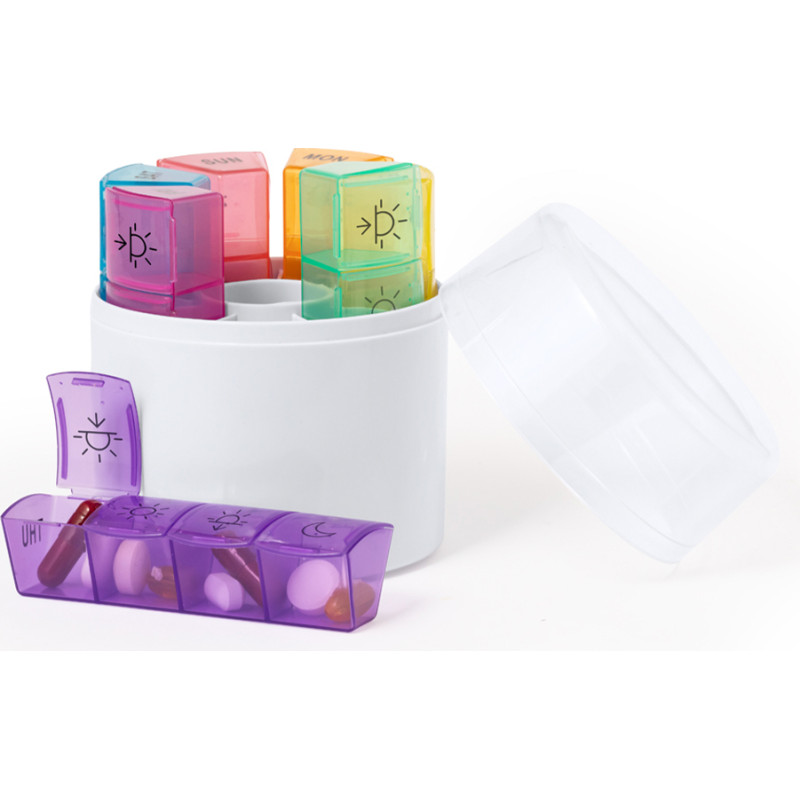 Compact weekly pill box. With 7 compartments divided by colours and acronyms to quickly identify the day of the week. Each compartment is subdivided into 4 independent cells for each part of the day. Presented in an individual recycled bag.