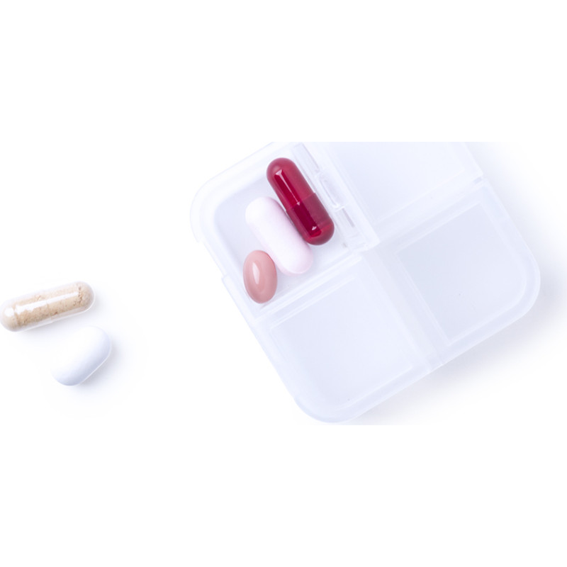 Pill box with 4 compartments in translucent finishing ABS, BPA free material. Individual lid per compartment.