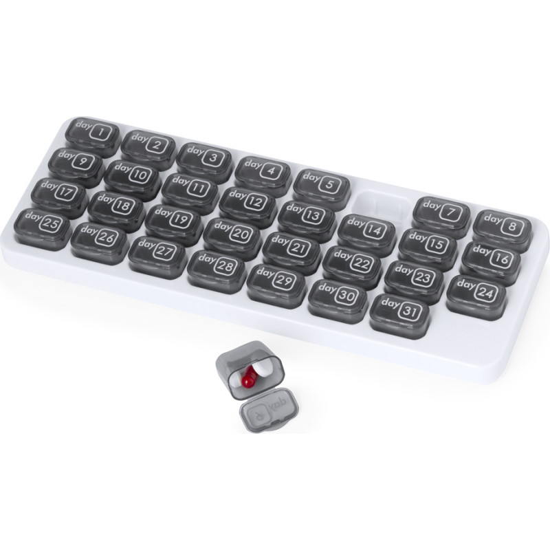 Original pastillero mensual fabricado en PP resistente, con 31 casillas independientes y extraíbles para guardar todas las pastillas necesarias para el día. Con base blanca y cajas grises impresas con el día del mes. Presentado en bolsa individual.