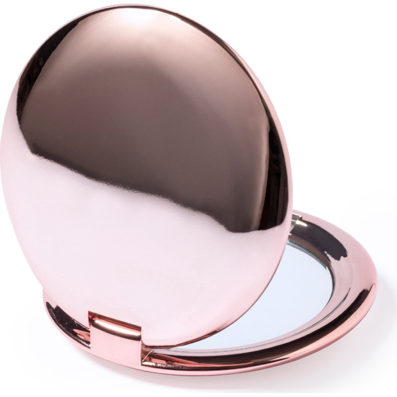 Folding mirror in elegant metallic finish. With two inside mirrors (1X and 2X magnification) and available in gold, silver and golden pink.