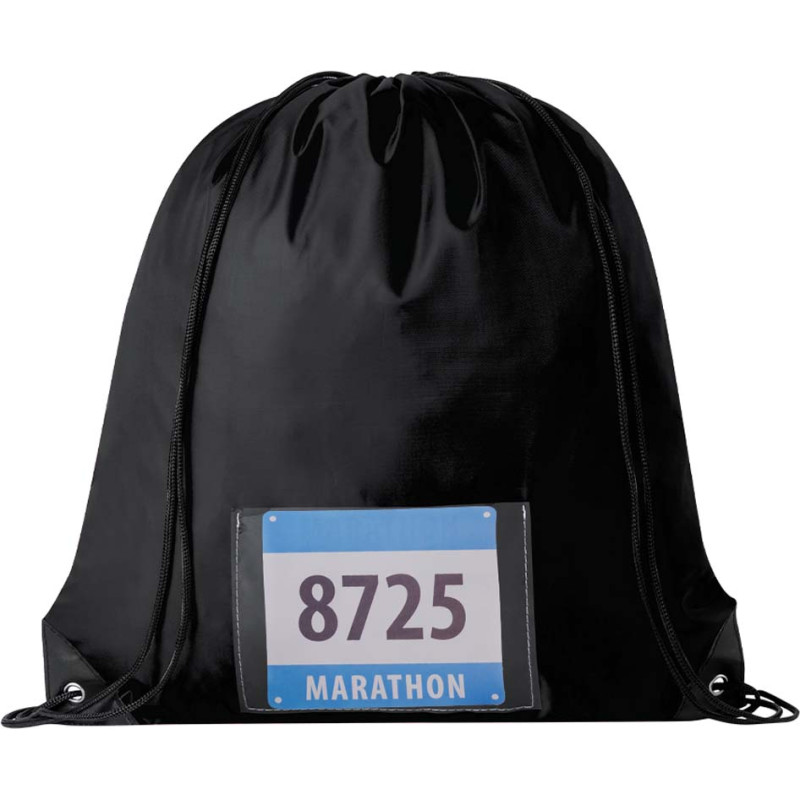 Drawstring backpack made of soft 210D polyester. Self-closing strings and black reinforced corners with metal eyelets. Including a transparent pocket for the number and available in a wide range of colours (white colour specially made for sublimation printing).