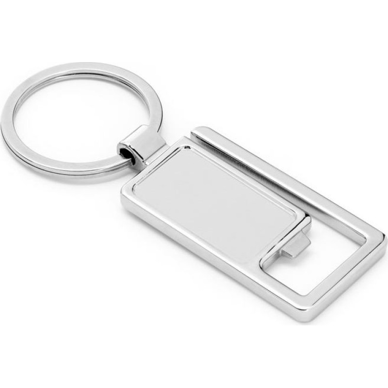 Metal keyring with indent for doming. Features a bottle opener and a carabiner. Supplied in a gift box. 29 x 52 x 4 mm