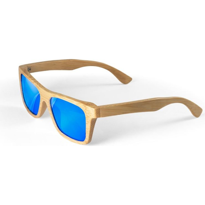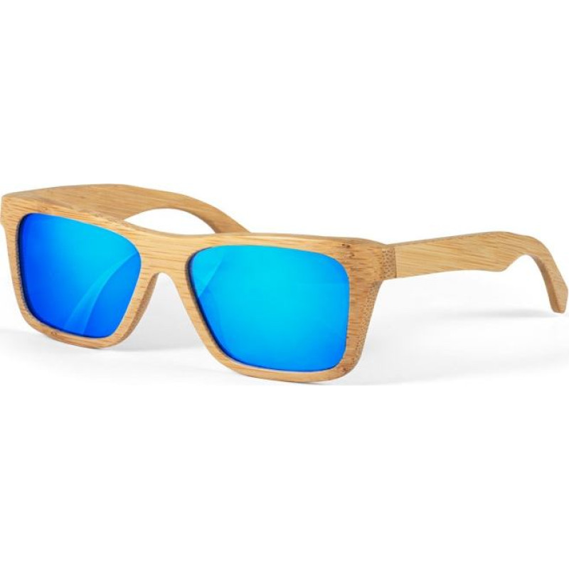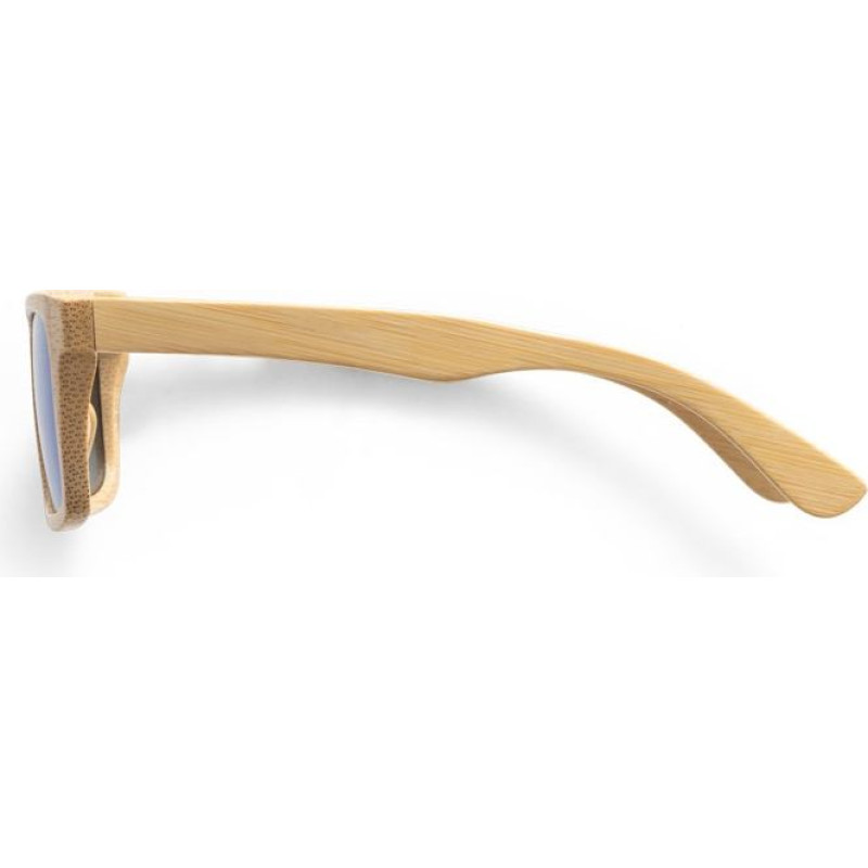 Bamboo sunglasses with mirrored lenses and UV400 protection. Supplied in a kraft paper pouch. As the product is made from natural materials, the colour and the printing result may vary between products. 147 x 46 x 150 mm